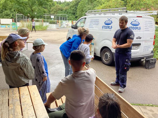 Heute berichtet Herr Daniel Enderle, der Firma Enderle aus Emmendingen, von seinem Beruf als Anlagenmechaniker für Sanitär- und Heizungstechnik. Er stellt den Handwerkerberuf vor und zeigt an praktischen Beispielen, wie seine Arbeit abläuft. Die Schüler und Schülerinnen haben im Vorfeld Fragen erarbeitet, die sie Herrn Enderle gestellt haben, u. A. „Was ist gut und was ist doof an deinem Beruf?“
